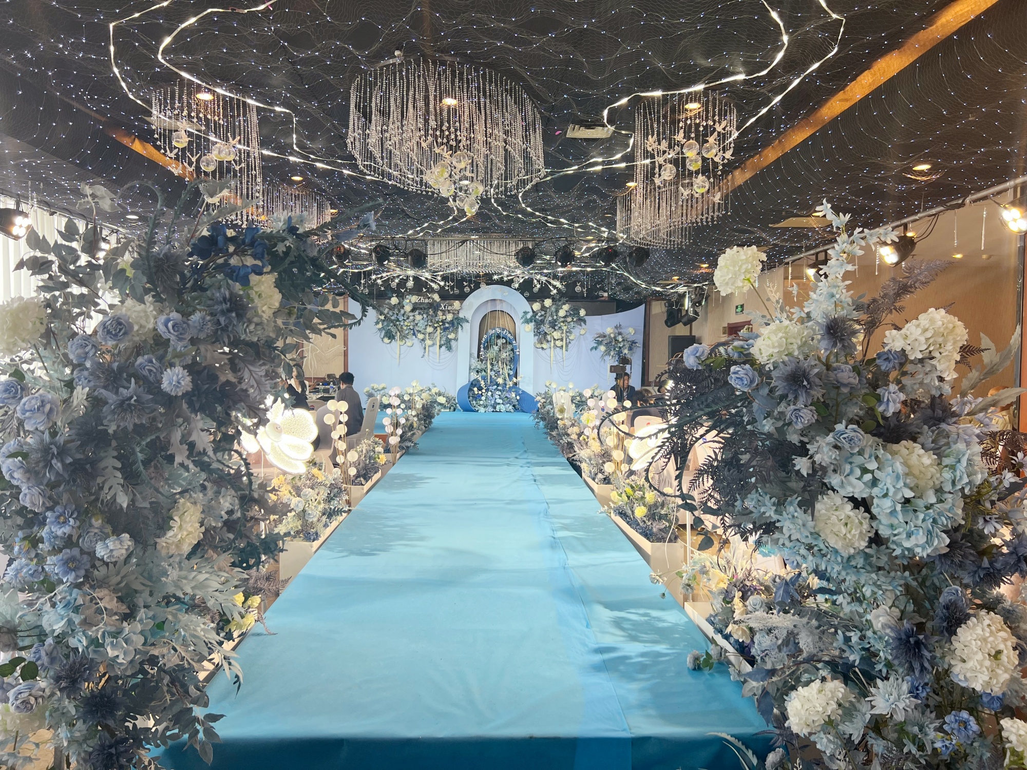 流蘇水晶透過燈光,柔和的光影和細(xì)膩靈動(dòng)的設(shè)計(jì),讓整場婚禮精致又高級(jí)。